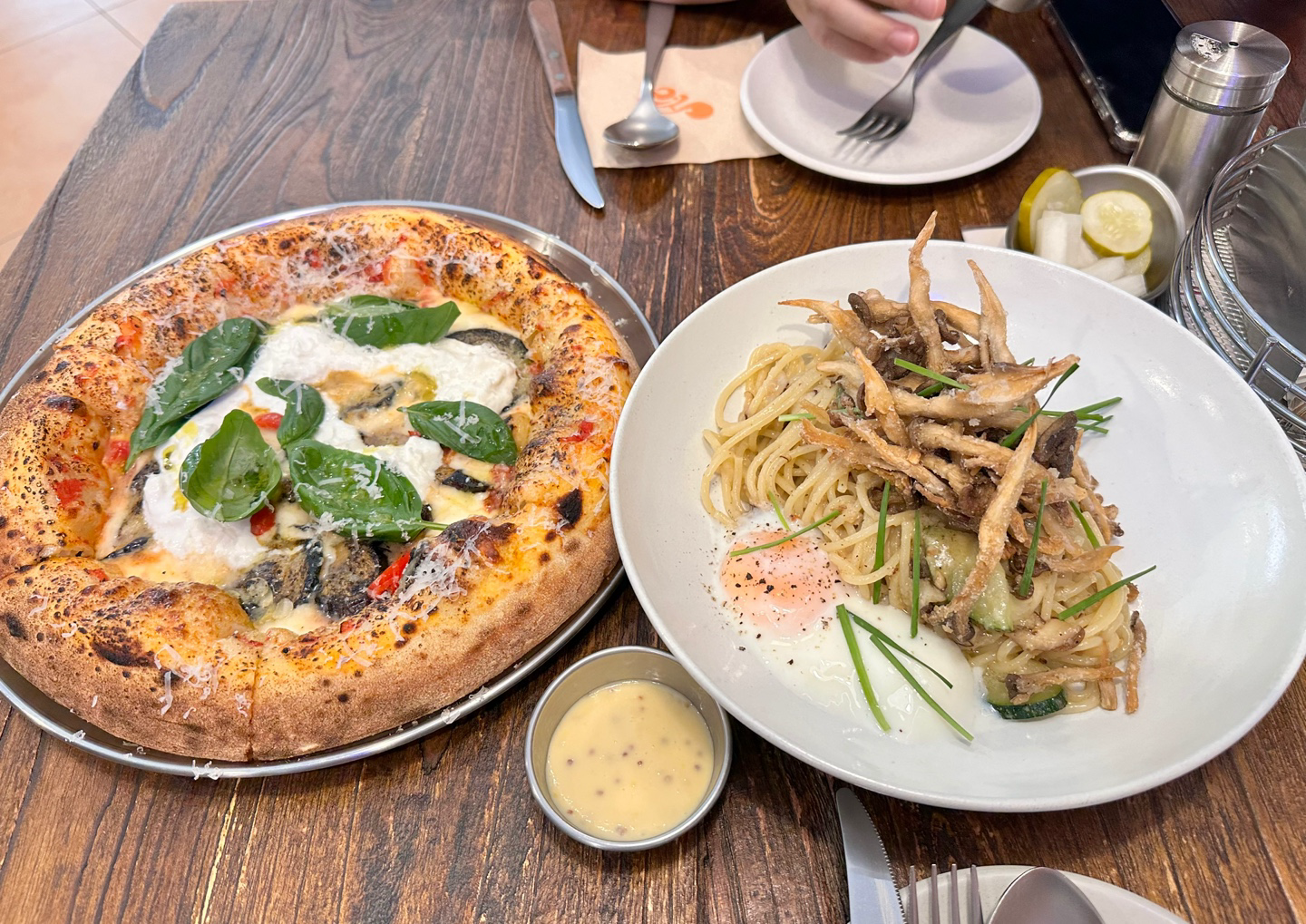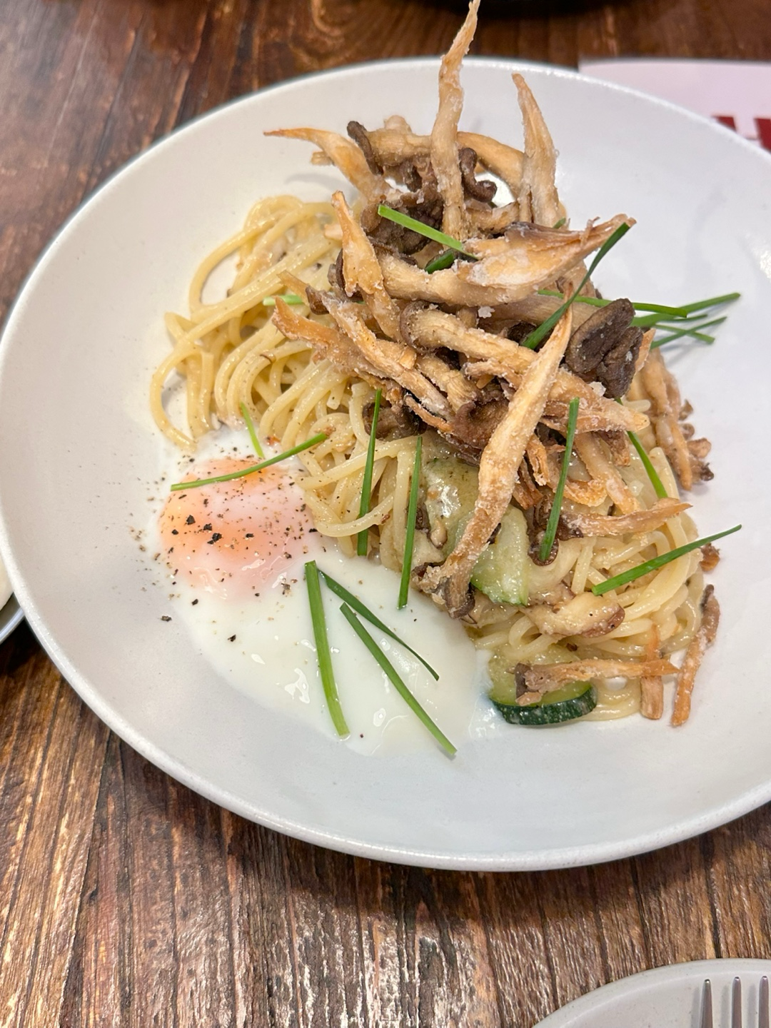 개인적으로 가장 인상 깊었던 메뉴입니다! 튀긴 버섯과 수란이 함께 나오는데, 수란을 터트려서 비벼 먹으면 크림을 넣지 않았는데도 꾸덕한 까르보나라 같은 풍미가 느껴져요. 버섯의 고소함과 소스의 깊은 맛이 어우러져 정말 접시를 싹 비우게 되더라고요. 파스타 좋아하시는 분들께 강력 추천!