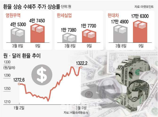 원화 약세는 수출 기업의 원화 환산 매출을 늘린다. 특히 IT(반도체·디스플레이), 자동차, 화학, 철강 등 대형 수출주는 환율 상승 시 실적 개선 기대감으로 주가가 오르는 경향이 있다.